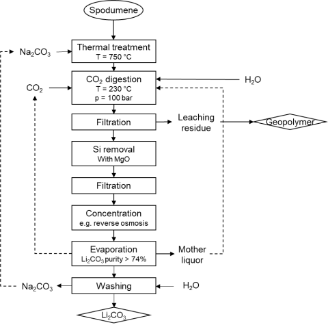 The liquid-to-solid ratio is an important parameter in this process. A higher ratio results in a smaller amount of spodumene being leached in a larger volume of water, leading to lithium concentrations in the solution that are 8-9 times lower compared to processes with lower liquid-to-solid ratios, although the percentage of lithium recovery is only slightly reduced. The downstream stage, after filtration and digestion, requires significant energy consumption during evaporation. To address this, initial tests were performed using nanofiltration. Ideally, nanofiltration would enable the separation of lithium from sodium, the main impurity, by concentrating the solution with lithium ions; however, due to the unavailability of lithium-selective membranes and considerable lithium loss (more than 25 %) with alternative membranes, this method was not pursued further. Subsequently, reverse osmosis membranes were utilized, successfully concentrating the solutions in the retentate and maximizing water removal prior to precipitation and lithium carbonate (Li₂CO₃) isolation. In the case of reverse osmosis, the lithium loss is lower than 1.5 %.